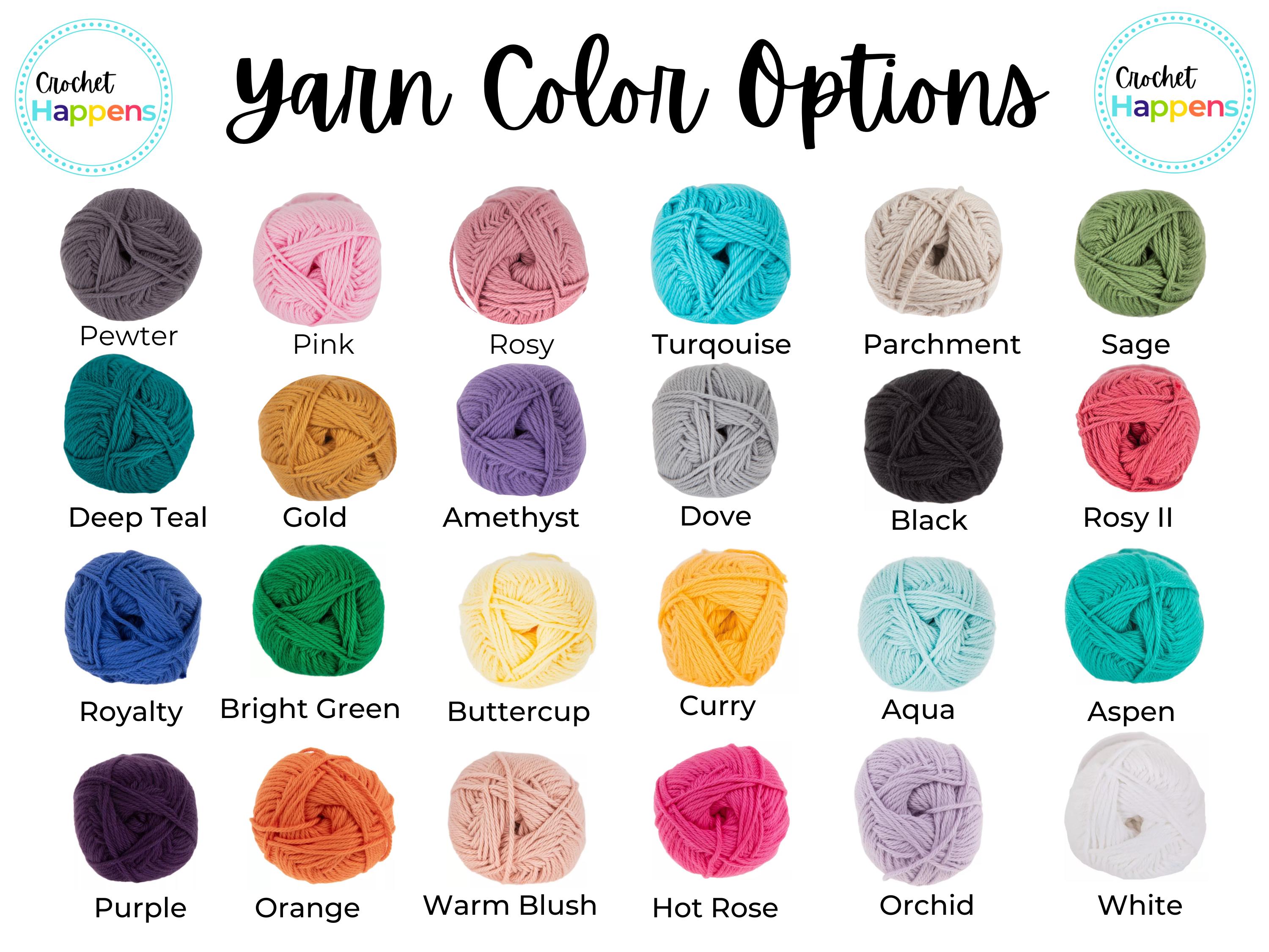 Hand crocheted using cotton yarn in your choice of color. Pictured in Gold, Rosy II, Deep Teal, Royal, Amethyst, and Sage.